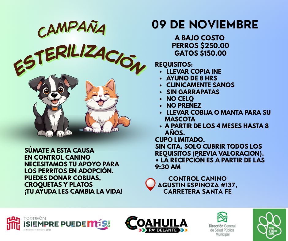 El próximo domingo 9 de noviembre, el Centro de Control Canino de Torreón llevará a cabo una campaña de esterilización para perros y gatos, con el objetivo de fomentar la tenencia responsable de mascotas y contribuir al control de la población animal en la ciudad.