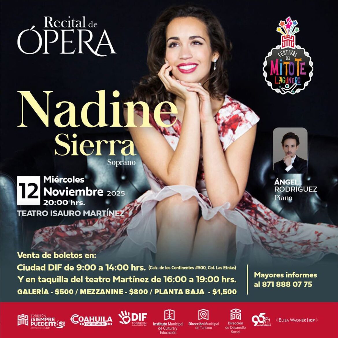 En el marco del Festival del Mitote Lagunero, el Sistema para el Desarrollo Integral de la Familia (DIF) Torreón, invita al Recital de Ópera con Nadine Sierra que se llevará a cabo el miércoles 12 de noviembre, a las 20:00 horas en el Teatro Isauro Martínez.