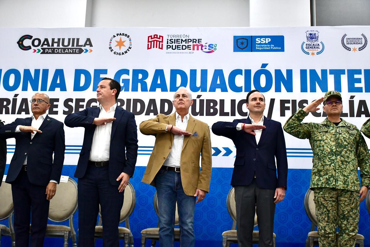 Además, el Alcalde expresó a los graduados el honor que representa servir a Torreón, Coahuila y México. “Mujeres y hombres que con gran voluntad, con trabajo, y con su esfuerzo y el de sus familias, han decidido servir a Coahuila, tienen sin duda el más alto honor. Los invito a servir con voluntad, con responsabilidad, con compromiso y a defender con su vida la seguridad de las familias de esta tierra”.