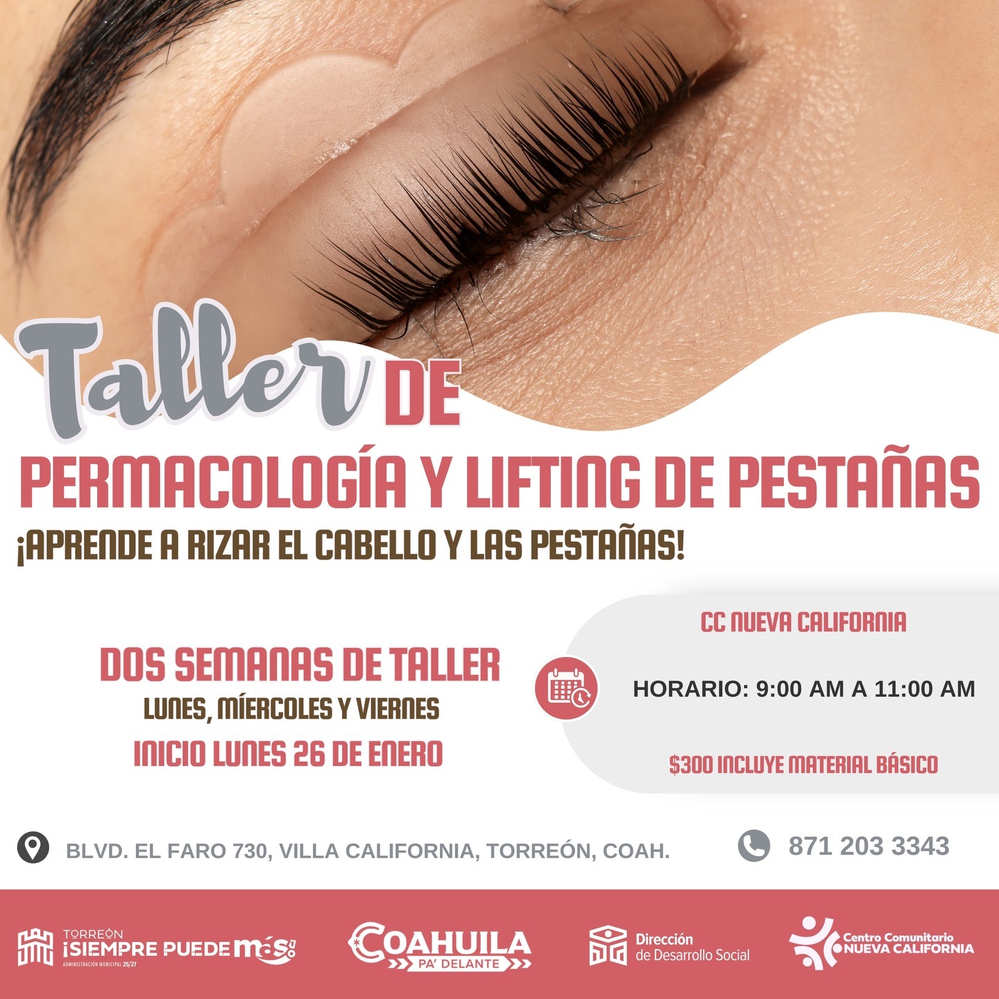 Con el objetivo de fortalecer las oportunidades de capacitación y crecimiento personal de la ciudadanía, la Dirección de Desarrollo Social llevará a cabo el taller de permacología y lifting de pestañas en el Centro Comunitario Nueva California, donde se ofrecerá a los participantes un espacio para aprender técnicas profesionales en el área de la belleza.