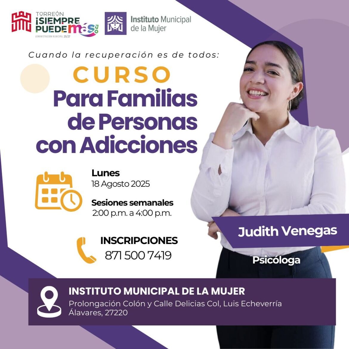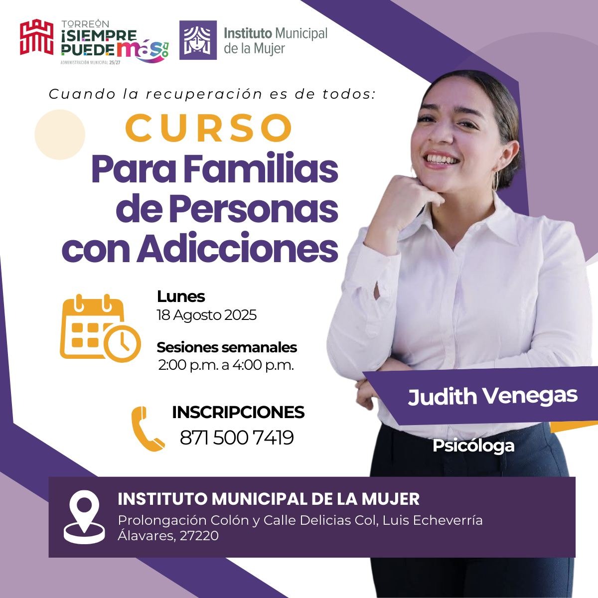 El Instituto Municipal de la Mujer (IMM) anunció el inicio del nuevo curso “Cuando la Recuperación es de Todos: Curso para Familias de Personas con Adicciones”, dirigido a madres, padres y familiares que deseen comprender y acompañar de forma saludable el proceso de recuperación de sus hijos e hijas.