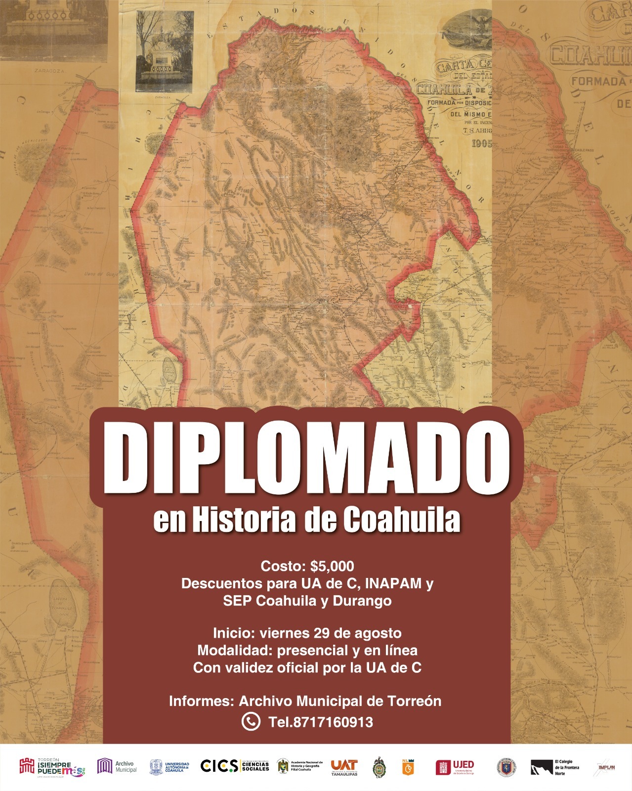 El Ayuntamiento de Torreón, a través del Archivo Municipal, el Centro de Investigación en Ciencias Sociales de la Universidad Autónoma de Coahuila, y la Academia Nacional de Historia y Geografía Filial Coahuila, extienden la invitación a formar parte del Diplomado en Historia de Coahuila.