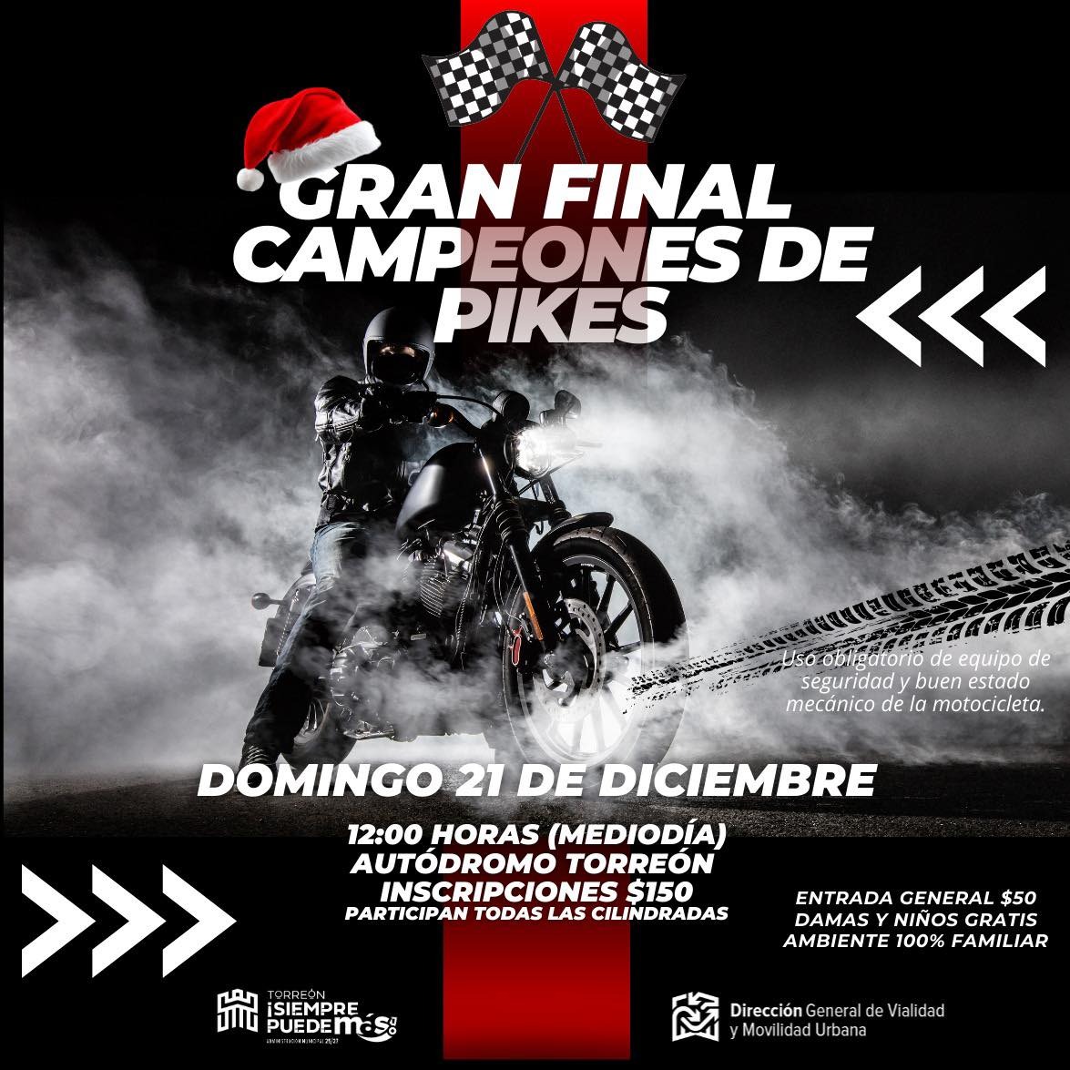 La Dirección General de Movilidad Urbana invita a la Gran Final de Campeones de Pikes que se llevará a cabo este domingo 21 de diciembre a las 12:00 horas, en las instalaciones del Autódromo Torreón. El evento contempla una serie de competencias controladas entre los motociclistas participantes, y cumple con todas las medidas de seguridad.