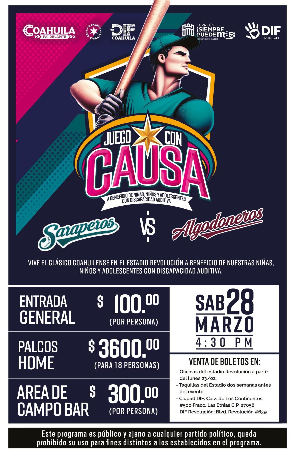 Como parte de las iniciativas impulsadas por el Sistema para el Desarrollo Integral de la Familia (DIF) Torreón, el próximo 28 de marzo se llevará a cabo el tradicional clásico de béisbol de Coahuila entre los equipos Saraperos de Saltillo y Algodoneros Unión Laguna, encuentro que este año tendrá una causa social a beneficio de niñas, niños y adolescentes con discapacidad auditiva.