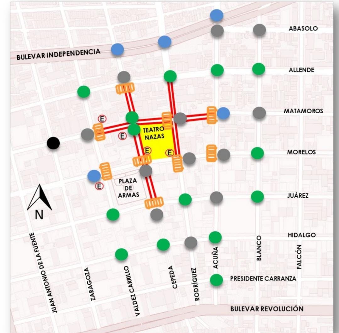 Avenida Matamoros desde la calle Valdez Carrillo hasta calle Acuña; calle Cepeda desde avenida Juárez hasta avenida Allende; y calle Rodríguez desde la avenida Morelos a la avenida Allende.