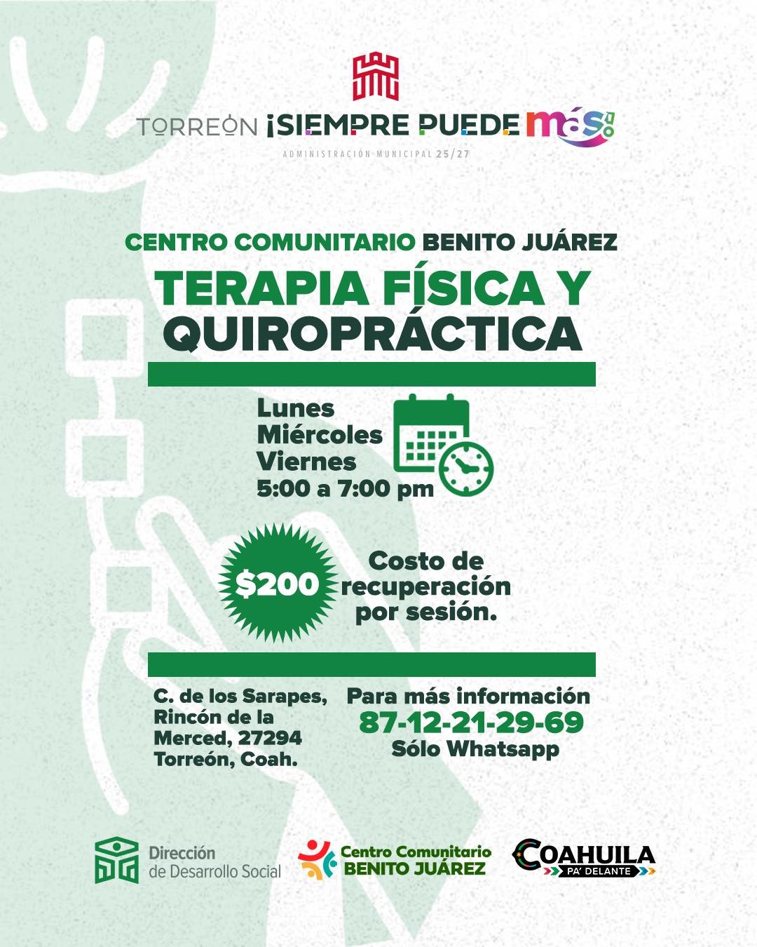 Como parte de las acciones en favor del bienestar y la salud de la población, la Dirección de Desarrollo Social puso en marcha el servicio de terapia física y quiropráctica en el Centro Comunitario Benito Juárez, ubicado en la colonia Rincón La Merced.