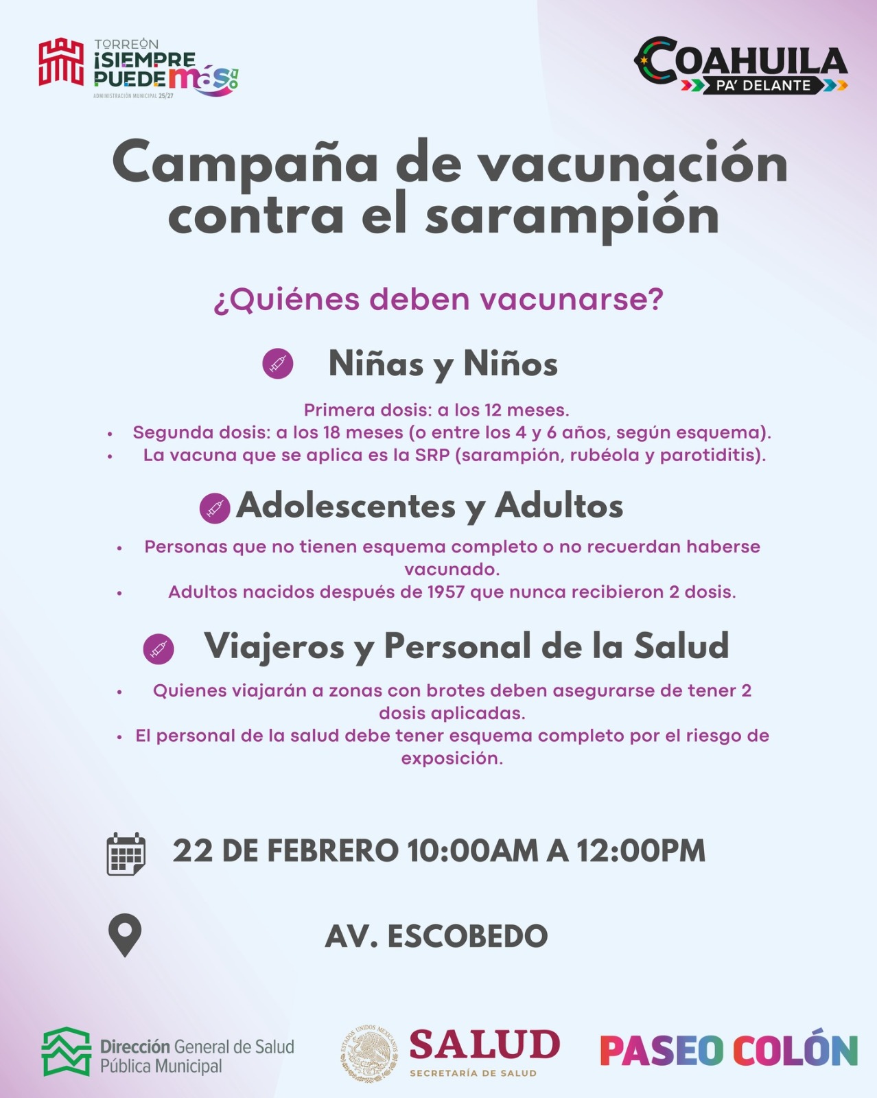 Con el objetivo de fortalecer la salud pública, este domingo 22 de febrero, el Paseo Colón será sede de una campaña de vacunación contra el sarampión, dirigida a niñas, niños, adolescentes y adultos, que requieran completar o iniciar su esquema.