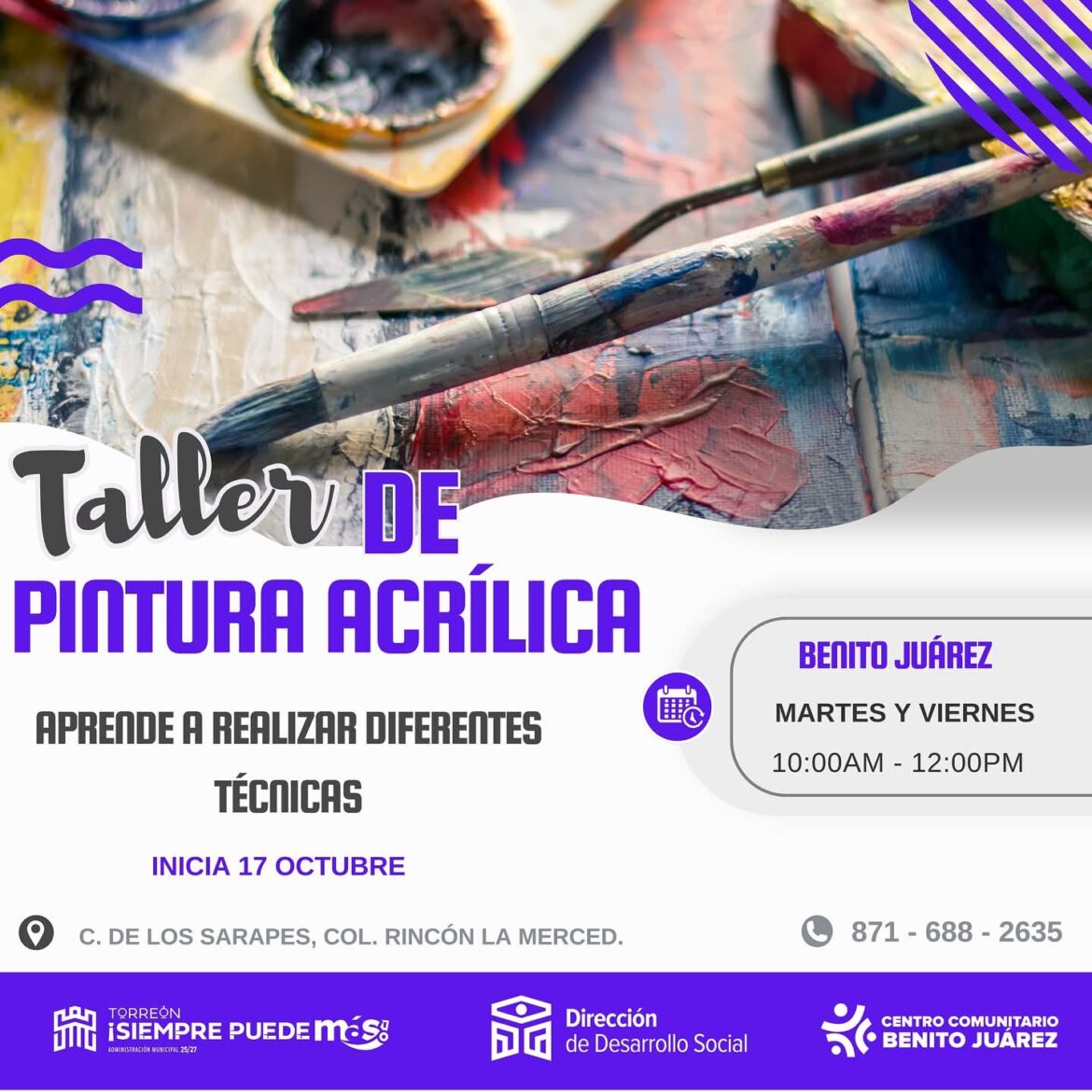 Con el objetivo de fomentar el aprendizaje, la creatividad y la convivencia entre la ciudadanía, la Administración Municipal, a través de la Dirección General de Desarrollo Social, invita al público en general a participar en las clases del taller de pintura acrílica que se llevará a cabo en el Centro Comunitario Benito Juárez, a partir del 17 de octubre.