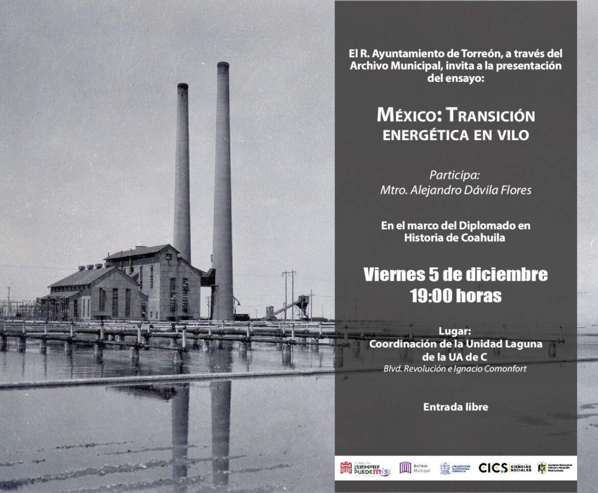 El Ayuntamiento de Torreón, a través del Archivo Municipal, invita a la presentación del ensayo: México: Transición energética en vilo, el próximo viernes 5 de diciembre a las 19:00 horas, que se llevará a cabo en la coordinación de la unidad Laguna de la Universidad Autónoma de Coahuila (UA de C).