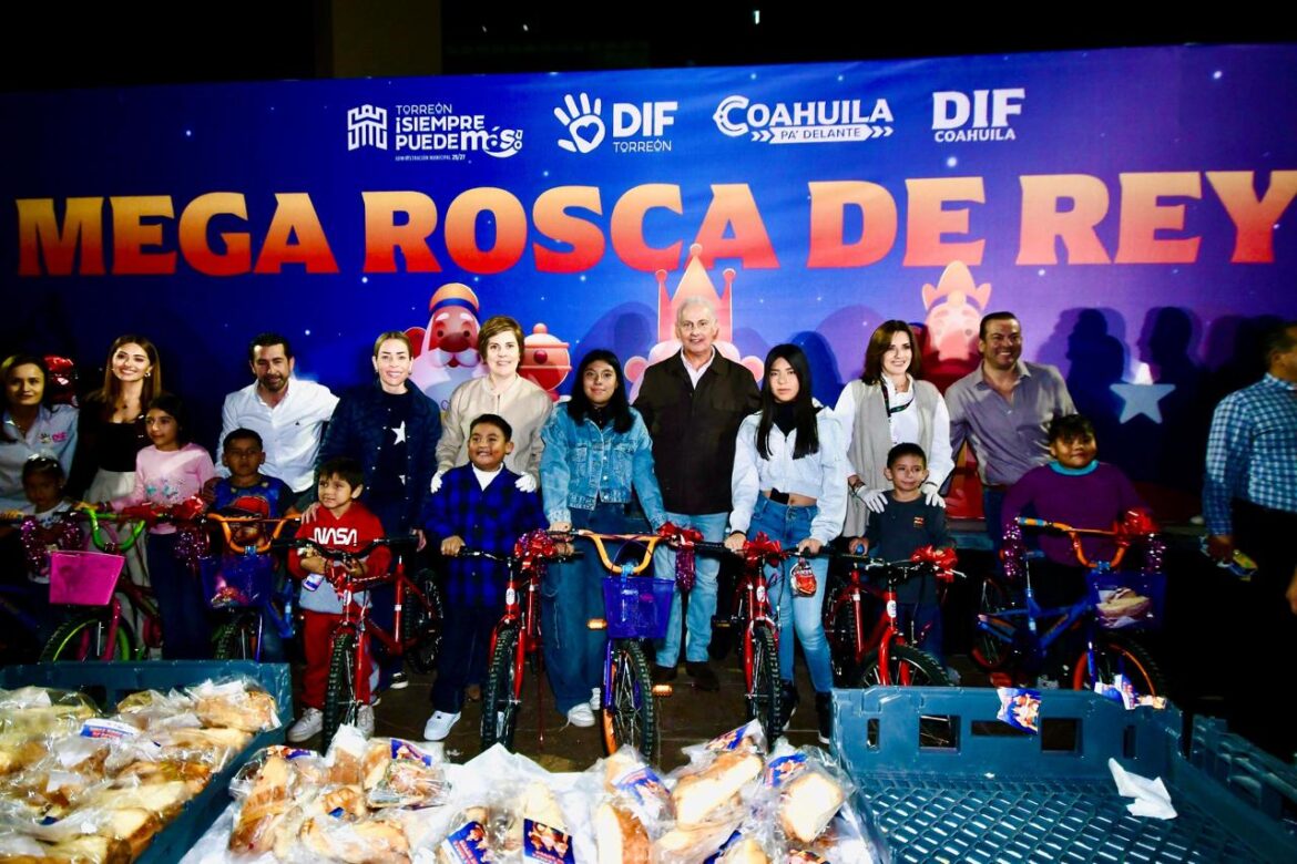 El alcalde Román Alberto Cepeda González, acompañado de la señora Selina Bremer de Cepeda, presidenta honoraria del DIF Torreón, así como de autoridades municipales y estatales, compartió la tradicional Mega Rosca de Reyes con 15 mil personas en la explanada de la Plaza Mayor.
