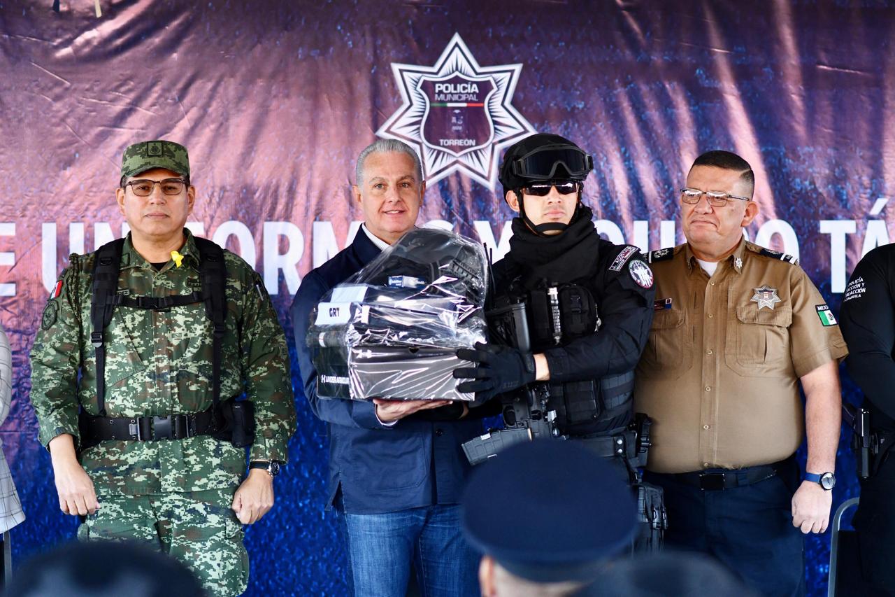“Vamos a seguir en la línea de la capacitación y la modernización, seguiremos haciendo un esfuerzo extraordinario para que nuestros elementos sigan entregándose y comprometidos con Torreón. Hoy tenemos nuevos uniformes tácticos y más equipamiento, es momento de continuar unidos por la ciudad que queremos y que agradezco al Alcalde y al Cabildo, a través de la comisión de seguridad, por esta iniciativa que nos ayuda a que sigamos destacando como una de las ciudades más seguras del país, con proximidad, reacción e inteligencia Torreón Siempre Puede”, declaró.