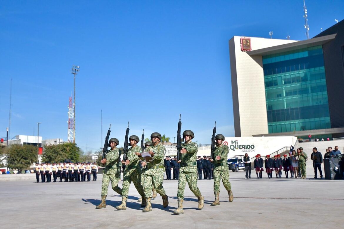 El alcalde de Torreón Román Alberto cepeda González, presidió este lunes el acto cívico conmemorativo al Día de la Bandera, celebrado en la explanada de la Plaza Mayor, donde estuvo acompañado por autoridades de la XI Región Militar, así como de los tres órdenes de Gobierno, y del sector educativo.