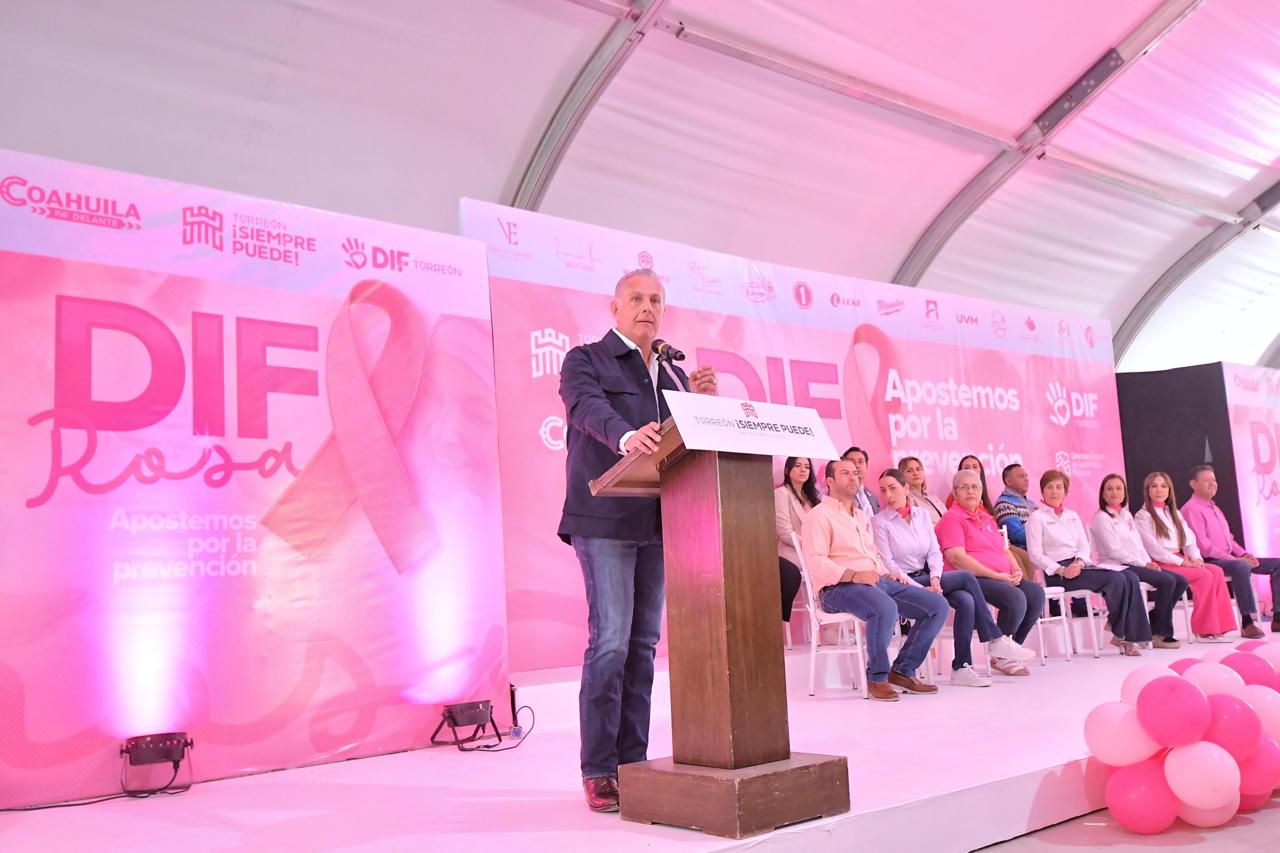 En el marco del Día Mundial de la Lucha Contra el Cáncer de Mama, el alcalde Román Alberto Cepeda González presidió este viernes la tercera edición de “DIF Rosa: Apostemos por la prevención”, organizada por la Administración Municipal y el Sistema para el Desarrollo Integral de la Familia, en sinergia con hospitales y empresas de Torreón, con el objetivo prevenir esta enfermedad y apoyar a las mujeres en la recuperación de su salud.