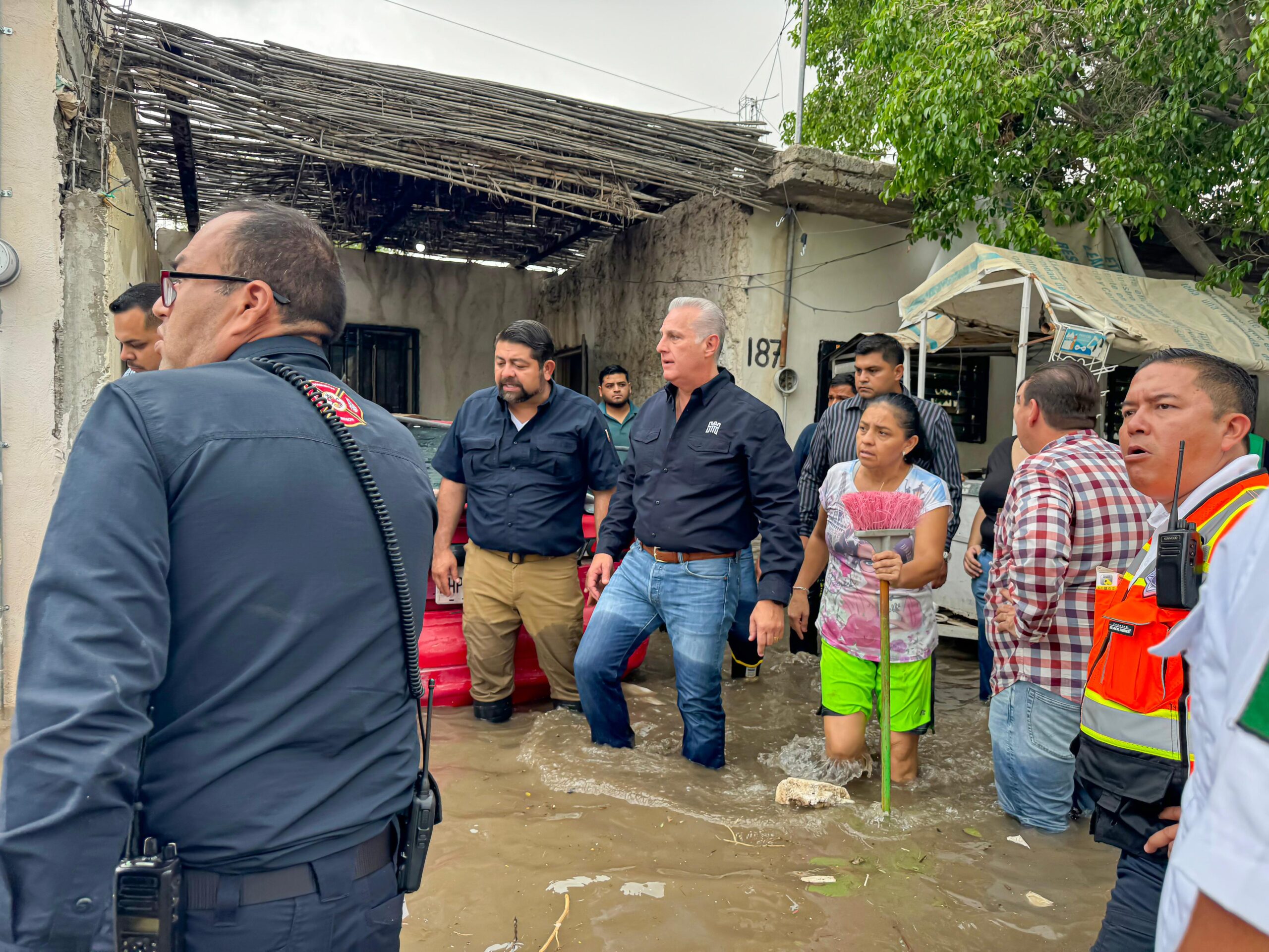 El alcalde Román Alberto Cepeda González realizó esta mañana un recorrido de supervisión por la laguna de regulación ubicada en la colonia Santiago Ramírez, así como en viviendas aledañas para atender personalmente a los vecinos afectados por las lluvias.