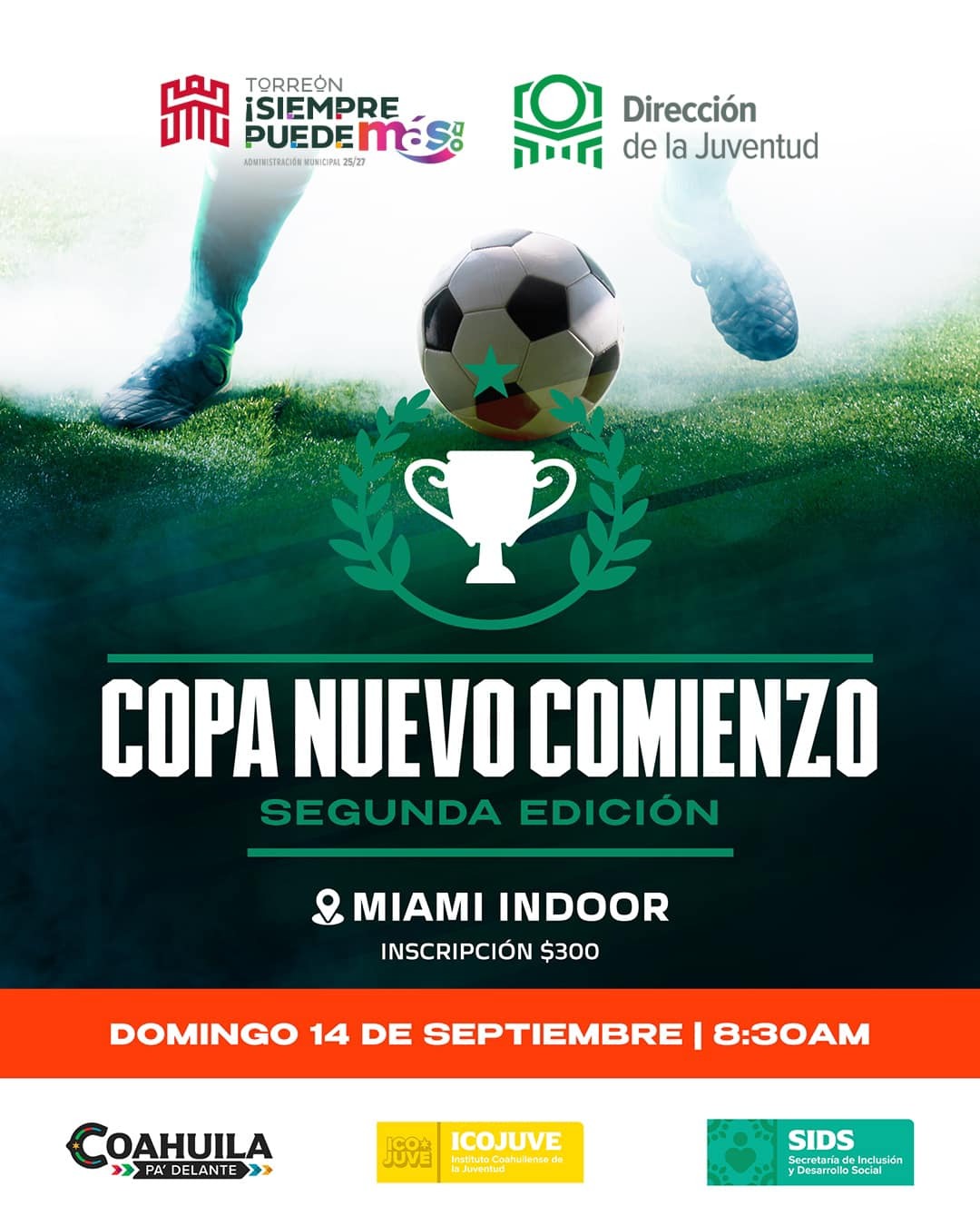 La Dirección de la Juventud informó que en coordinación con el Instituto Coahuilense de la Juventud y la Unidad de Prevención Social de la Violencia, se llevará a cabo mañana domingo 14 de septiembre a las 8:30 horas, en el Club Deportivo Miami Indoor, y la premiación tendrá lugar ese mismo día, a partir de las 13:00 horas. El equipo ganador será reconocido con un premio de 2 mil pesos.